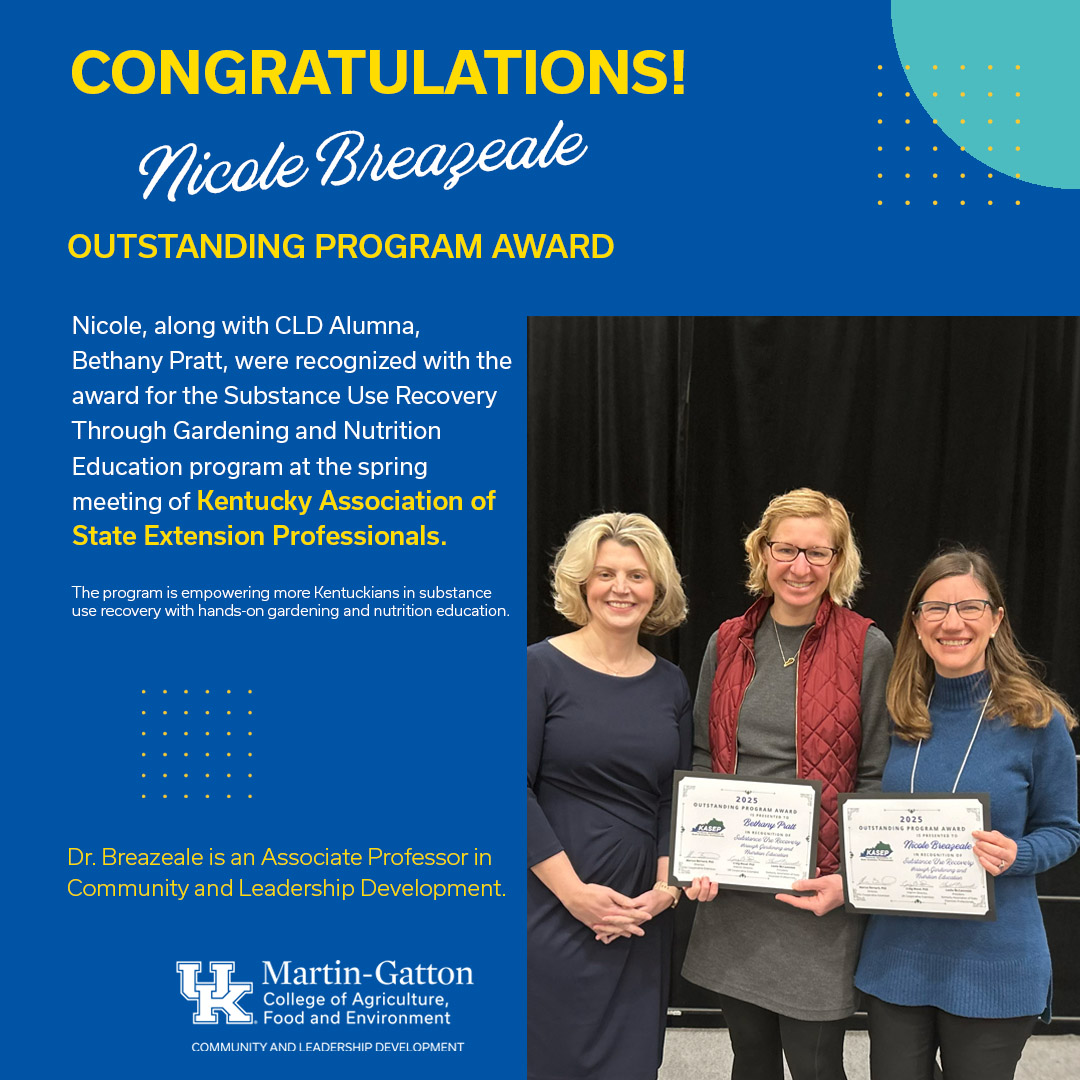 This project was supported by a Kentucky Department of Agriculture Specialty Crop grant, which, in 2024, funded 17 sites where Extension Agents and Nutrition Education Assistants are doing this collaborative work. They have produced a 164-page toolkit that highlights the importance of leadership development with those in recovery, the need to develop collaborative partnerships with recovery center administrators, among many other CLD and related topics. They have fostered a Community of Practice and provide training and 1:1 support for the Extension personnel working in this space. Program results through Ripple Effects Mapping detail a wide range of benefits and community-level impacts.