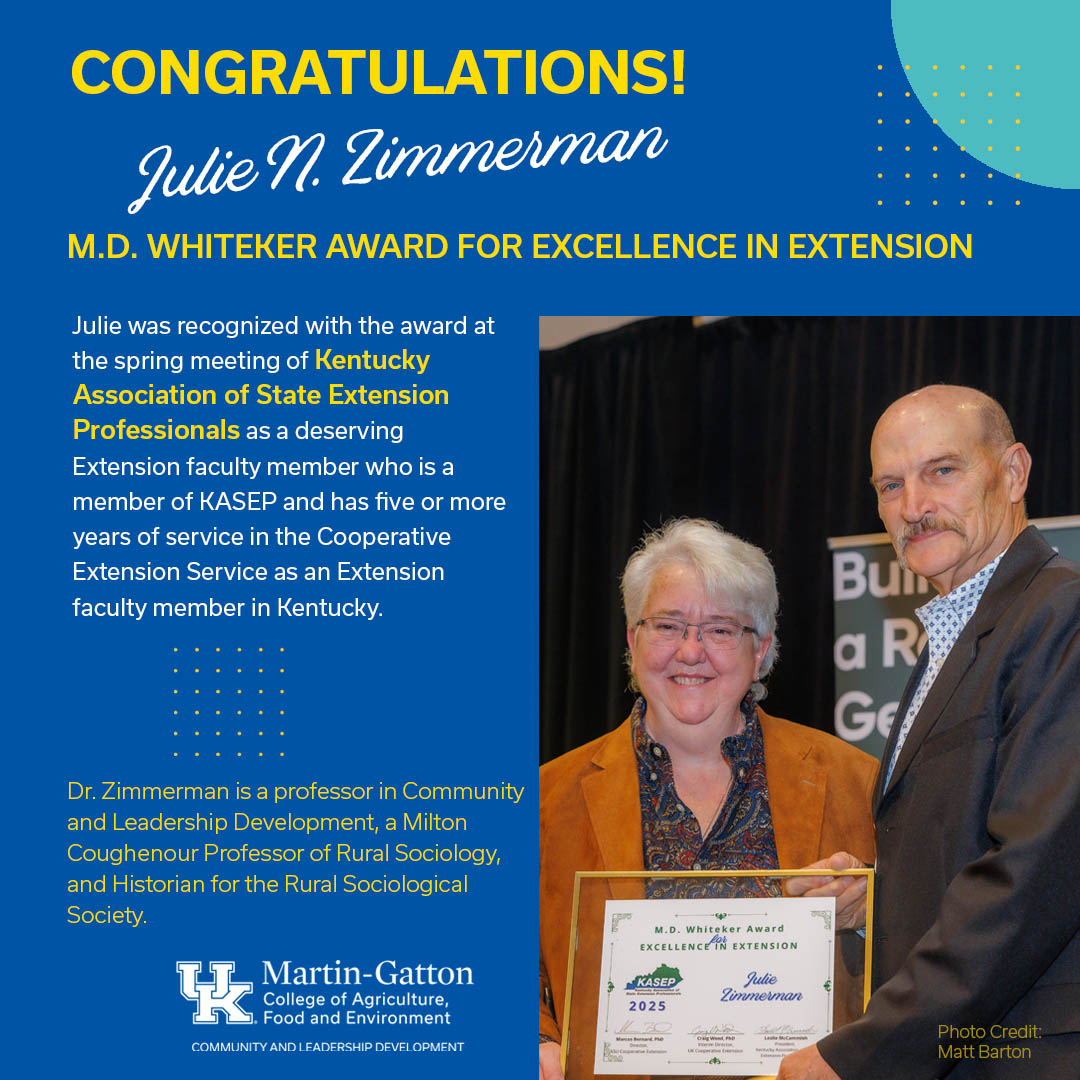 Dr. Julie N. Zimmerman was recognized with the top award from the Kentucky Association of State Extension Professionals (KASEP) during their spring meeting as a deserving Extension faculty member who is a member of KASEP and has five or more years of service in the Cooperative Extension Service as an Extension faculty member in Kentucky.